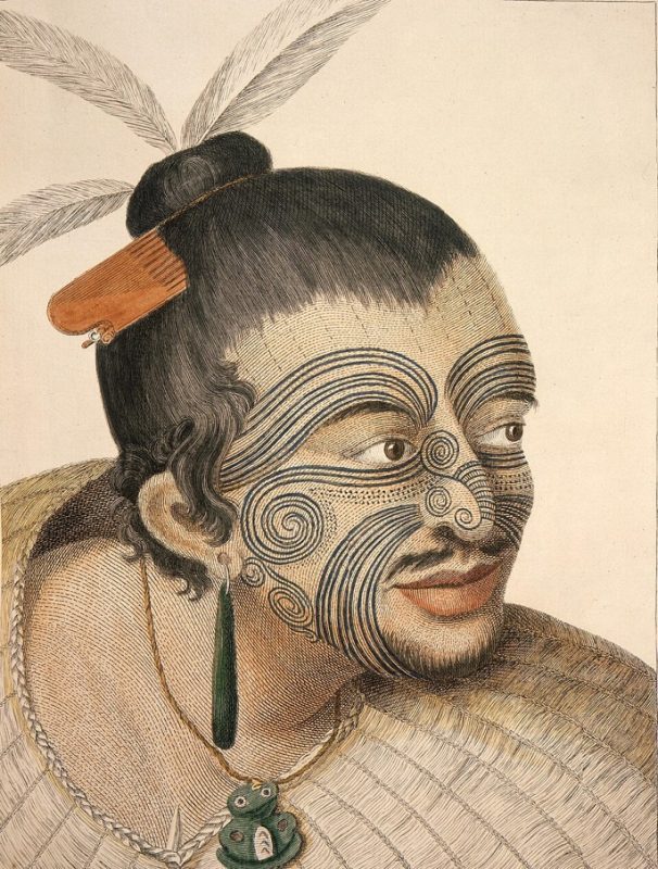 Le tatouage était chez les Maoris, pour l’essentiel, un art rituel, pratiqué lors de passages décisifs et sacrés de l’existence, et réservé à des classes sociales très spécifiques, comme ce chef maori dont le portrait a été dessiné au XVIIIème siècle :