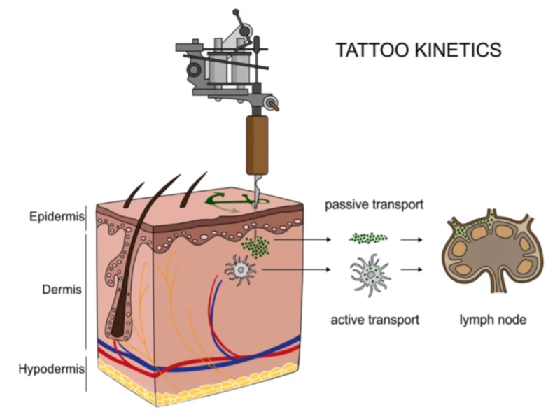 En 2017, une étude publiée dans Scientific Reports révélait que les nanoparticules des encres de tatouage, loin de se disparaître avec le temps, circulaient dans le système lymphatique et finissaient par coloniser les ganglions lymphatiques[4].