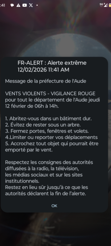Même en cas de circonstances météo exceptionnelles, comme c’était le cas ici, je ne comprends pas que l’on actionne ce type de technologie d’alarme qui peut, en fonction des circonstances dans lesquelles on la reçoit, véritablement mettre en danger la vie du destinataire et de son entourage.