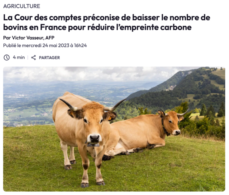 On sait effectivement déjà que la réduction du cheptel bovin français a été avancée comme une mesure nécessaire par la Cour des comptes en mai 2023[3] :