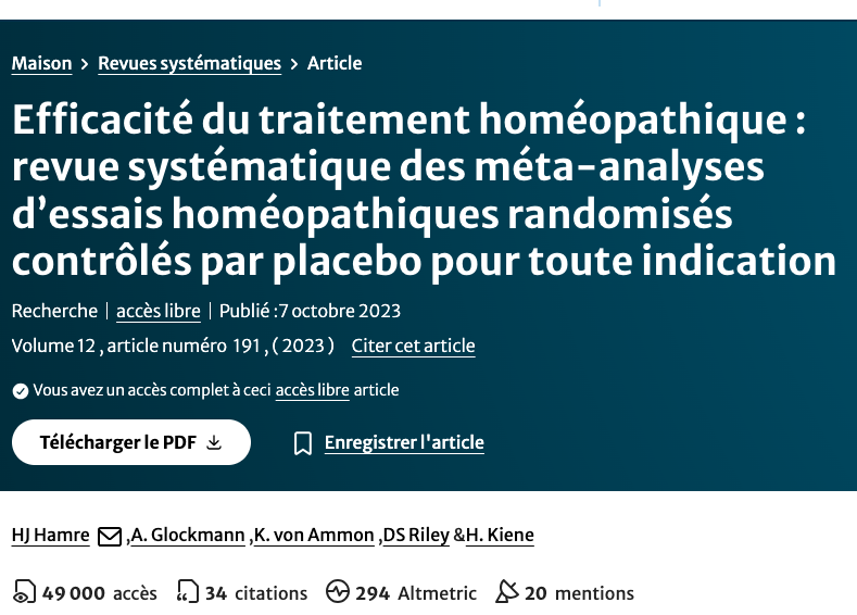 [2] https://link.springer.com/article/10.1186/s13643-023-02313-2 – H.J. Hamre et al., «Efficacy of homoeopathic treatment : Systematic review of meta-analyses of ramdomised placebo-controlled homoeopathy trials for any indication», in Springer Nature Link, 7 october 2023