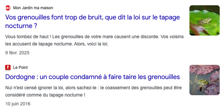 [2] https://monjardinmamaison.maison-travaux.fr/mon-jardin-ma-maison/actualites-jardin/tapage-nocturne-loi-grenouilles-bruyantes-494390.html – Alexis Petit, « Vos grenouilles font trop de bruit, que dit la loi sur le tapage nocturne ? », in Mon jardin ma maison, 9 février 2025
