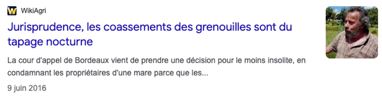 Il y a dix ans, la cour d’appel de Bordeaux a même décrété que les coassements des grenouilles étaient du tapage nocturne et a condamné les propriétaires d’une mare où des batraciens s’épanchaient à la combler[1].